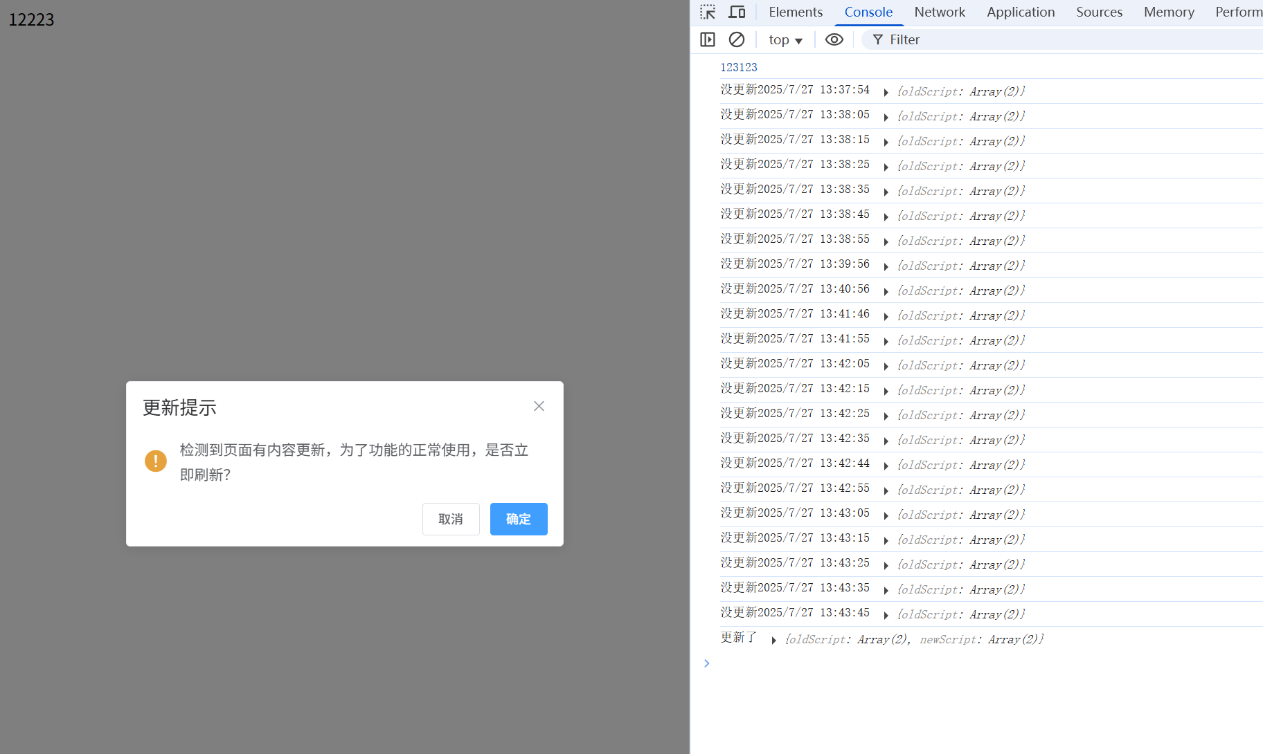 1 2 3 4 5 6 7 8 9 10 11 12 13 14 15 16 17 18 19 20 21 22 23 24 25 26 27 28 29 30 31 32 33 34 35 36 37 38 39 40 41 42 43 44 45 46 47 48 49 50 51 52 53 54 55 56 57 58 59 60 61 62 63 64 65 66 67 68 69 70 71 72 73 74 75 76 77 78 import { MessageBox } from 'element-ui' ;const modelConfirm = (title, message, type='warning' ) => { return new Promise ((resolve, reject ) => { MessageBox .confirm (message, title, { type }).then (() => { refreshPage (); }).catch (() => { reject (); }); }); }; function refreshPage ( ) { const timestamp = new Date ().getTime (); window .location .href = window .location .pathname + '?t=' + timestamp; location.reload (); localStorage .clear (); sessionStorage.clear (); } let scriptHashes = new Set ();let timer = undefined ;async function fetchScriptHashes ( ) { const html = await fetch ('/?_timestamp=' + Date .now ()).then ((resp ) => resp.text ()); const scriptRegex = /<script(?:\s+[^>]*)?>(.*?)<\/script\s*>/gi ; const scripts = html.match (scriptRegex) ?? []; return new Set (scripts); } async function compareScriptHashes ( ) { const newScriptHashes = await fetchScriptHashes (); if (scriptHashes.size === 0 ) { scriptHashes = newScriptHashes; } else if ( scriptHashes.size !== newScriptHashes.size || ![...scriptHashes].every ((hash ) => newScriptHashes.has (hash)) ) { console .info ('更新了' , { oldScript : [...scriptHashes], newScript : [...newScriptHashes], }); clearInterval (timer); modelConfirm ('更新提示' ,'检测到页面有内容更新,为了功能的正常使用,是否立即刷新?' ); } else { console .info (`没更新${new Date ().toLocaleString()} ` , { oldScript : [...scriptHashes], }); } } export function autoRefresh ( ) { timer = setInterval (compareScriptHashes, 10000 ); }