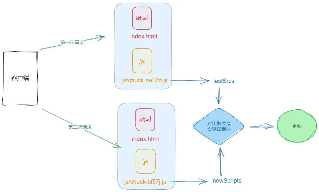 比较构建文件的 hash 值 这里用轮询 的方式请求 index.html 文件,从中解析里面所有的 js 文件,由于 vue 打包后每个 js 文件都有指纹标识,因此对比每次打包后的指纹,分析文件是否存在变动,如果有变动则提示用户更新!(该方案需要 webpack/vite 开启打包文件带上 hash 值)